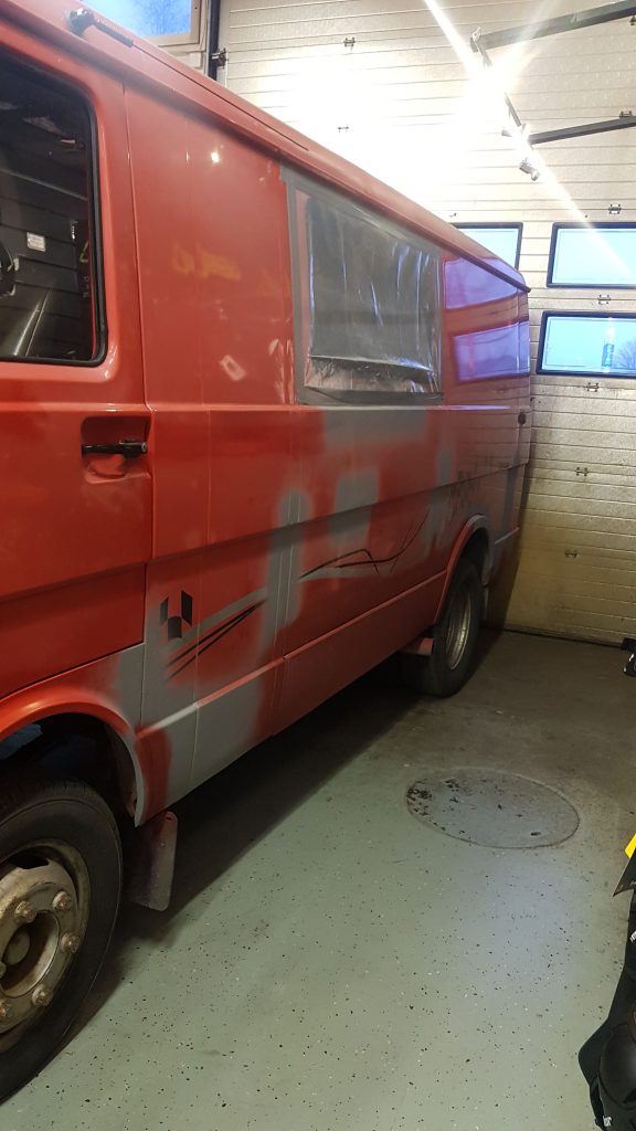 Valmista tuli kuitenkin ennen maalarille lähtöä. Sivuikkuna otettiin irti ja tuulilasi on kiinni Jeesusteipillä. Aukasin myös jo valmiiksi niitit peilien kiinnikkeistä ja irroittelin ovenkahvat, antennit yms irti lähtevät.